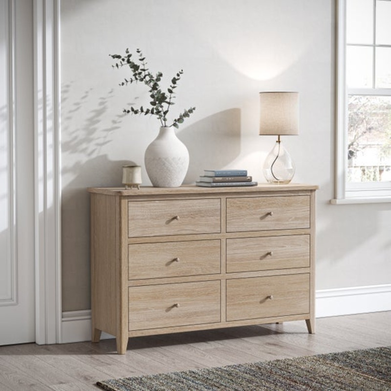 Updated and improved Design of a Dunelm classicSolid pine and oak veneerBoth wooden and metal handles includedPainted and wax finishNo assembly requiredBring a balance of style and storage to your home with the Bromley II 6 Drawer Chest. This beautifully c