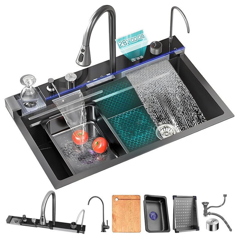 This kitchen stainless steel kitchen sink adopts the inner wall sliding design, and there are double-layer sliding tracks on both sides of the inner wall for sink accessories, so as to achieve the largest working space of the waterfall kitchen sink.