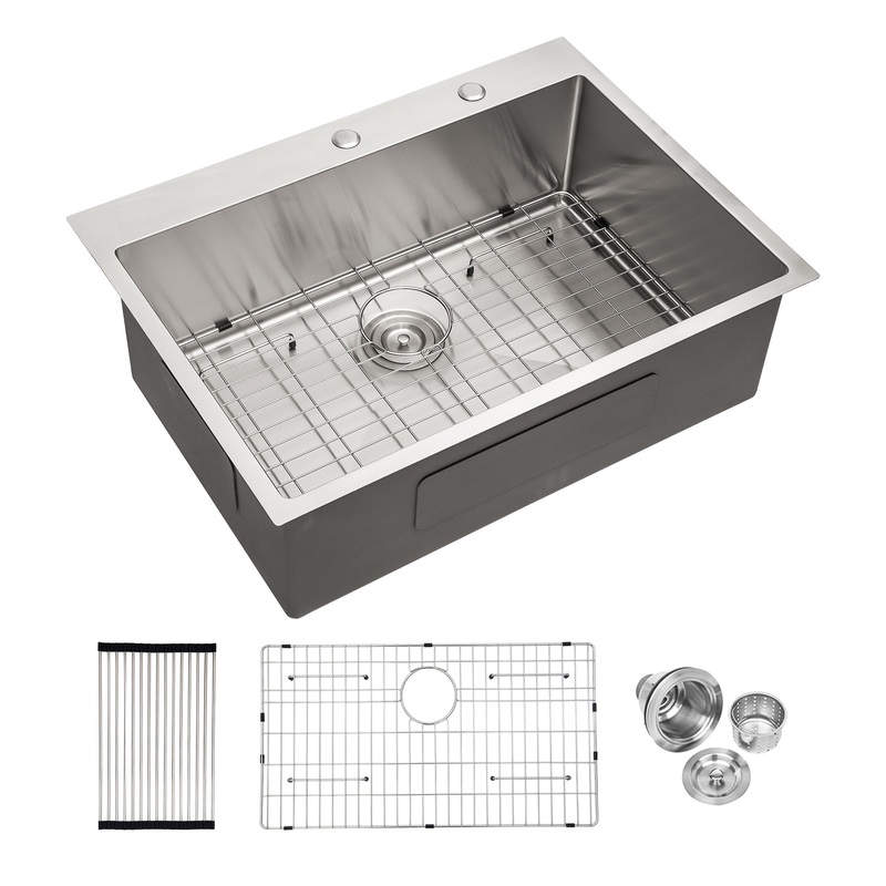 This drop-in kitchen sink created a clean contemporary look that fits perfectly into any environment, from rustic or traditional to urban kitchens. It is handcrafted from premium 16 Gauge stainless steel thickness for maximum durability, with excellent cor