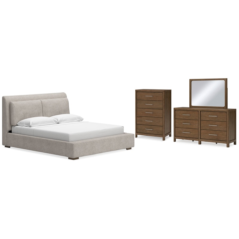 This bedroom package sits comfortably at the intersection of modern lodge and farmhouse aesthetics. Your warm and welcoming disposition is reflected in the charming architectural elements and light brown glazed finish. Even with its poise, the set remains practical, defining your bedroom with reliable function and style.