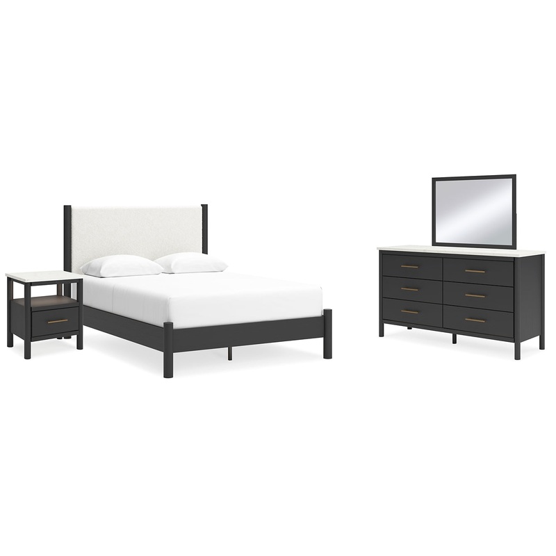 Cadmori Queen Upholstered Panel Bed with Mirrored Dresser and Nightstand