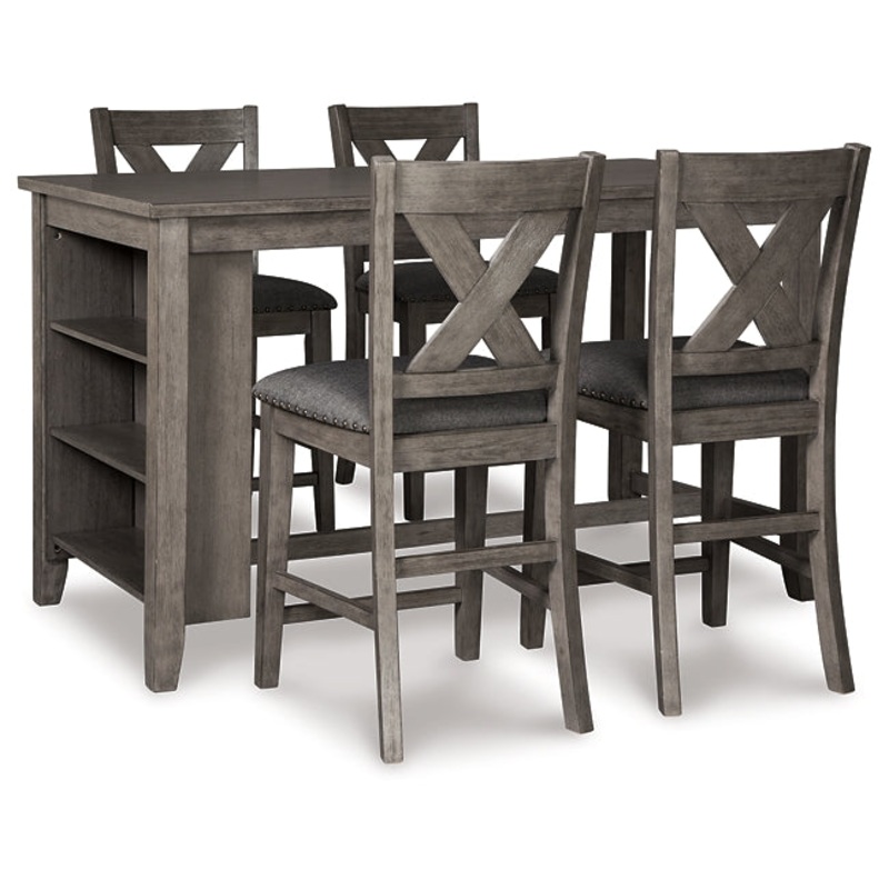 Bring a relaxed yet refined sense of good taste to your space with this 5-piece counter-height dining set. The antiqued gray wash finish gives the clean-lined design a casually cool sensibility. The tables side shelves cleverly balance form and function wh