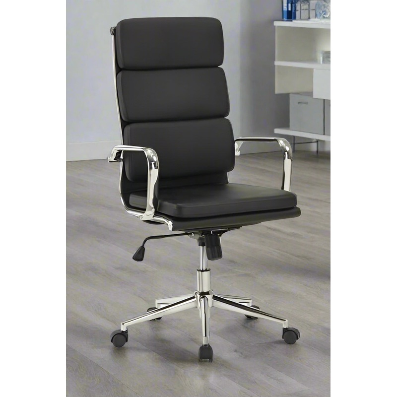 Feature- High back chair suitable for managers-Height adjustment feature ensures correct sitting posture-Cushioned backrest provides adequate lumbar support-Curved armrests offer relaxed sitting posture-Chromed finish or black nylon base with casters allow