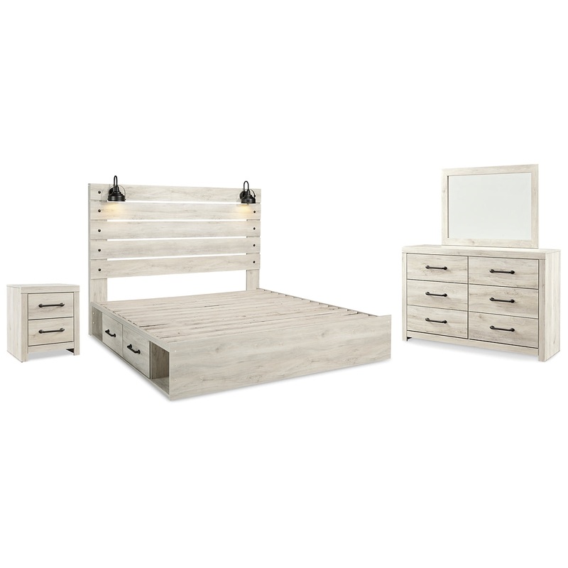 Details B192B19: Includes headboard, footboard, side storage, rails and slats, Made of engineered wood (MDF/particleboard) and decorative laminate, Wispy white finish over replicated oak grain with authentic touch, Large-scale hardware with dark finish, 2 decorative sconce lights, LED with 3 AA batteries, 2 smooth-gliding storage drawers, 2 storage cubbies, 2 slim-profile USB charging ports, Power cord included; UL-listed, Bed does not require additional foundation/box spring; accommodates most zero clearance adjustable bases with the addition of a bunkie board, Mattress available, sold separately, Assembly required, B192B1: Includes dresser with mirror, Made of engineered wood (MDF/particleboard) and decorative laminate, Wispy white finish over replicated oak grain with authentic touch, 6 smooth-gliding drawers, Drawer interiors are lined with a faux linen laminate for a clean, finished look, Large-scale hardware with dark finish, Mirror attaches to back of dresser, Assembly required, B192-92: Made of engineered wood (MDF/particleboard) and decorative laminate, Wispy white finish over replicated oak grain with authentic touch, Large-scale hardware with dark finish, 2 smooth-gliding drawers, Drawers lined with faux linen laminate for finished aesthetic, 2 slim-profile USB charging stations, Power cord included; UL Listed,