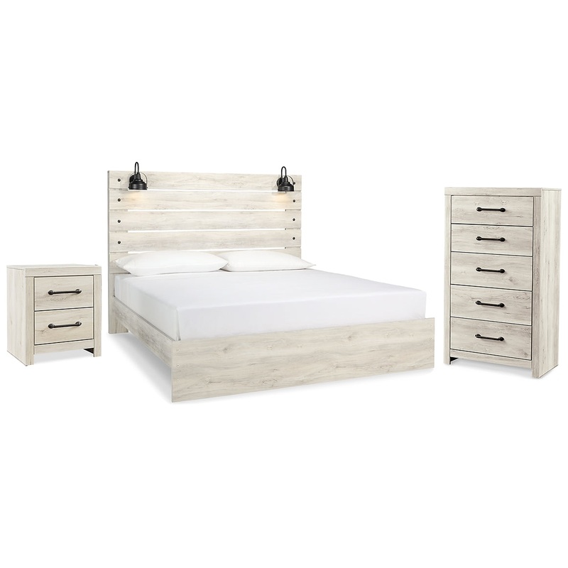 What a delightful take on rustic industrial style. Whether modern loft or modern farmhouse, this bedroom package makes itself at home. The wispy whitewash palette enhances without covering the grain for that weathered look you crave. Youre sure to find the retro-chic light sconce and USB plug-ins such a bright idea.