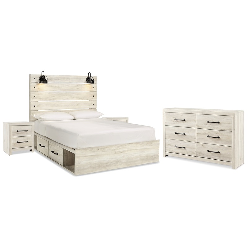 What a delightful take on rustic industrial style. Whether modern loft or modern farmhouse, this queen panel storage bed makes itself at home. The wispy whitewash palette enhances without covering the grain for that weathered look you crave. Love to read in bed? Youre sure to find the retro-chic light sconces and USB plug-ins on the open-slat style headboard such a bright idea. Elongated drawer pulls on the under bed storage drawers elevate the aesthetic. Dresser and 2 nightstands included.