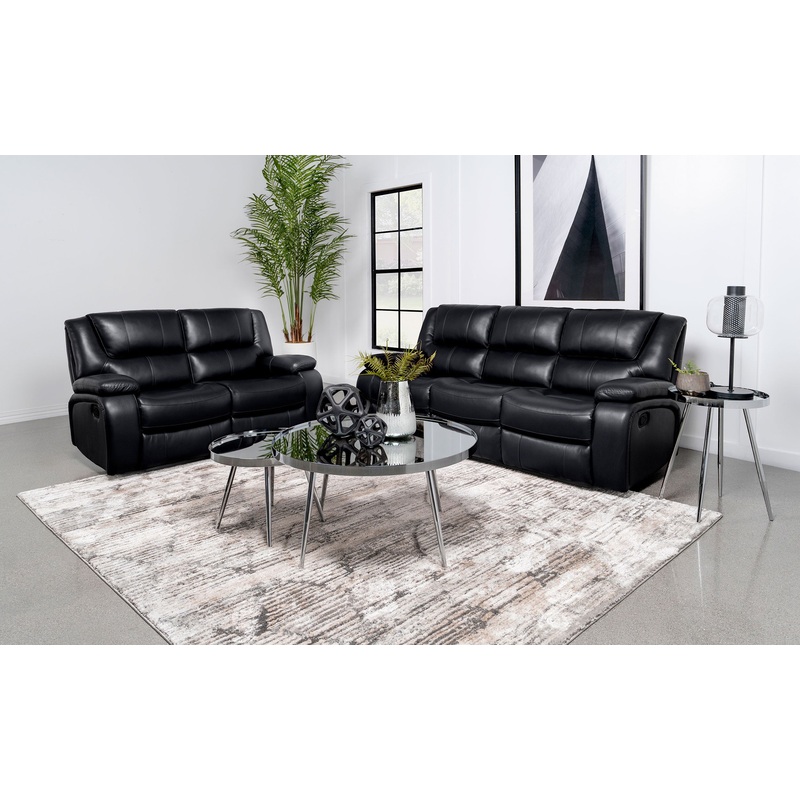 Bold black leatherette upholstery offers the look of luxurious leather with easy-care maintenance as the two-piece motion sofa set is versatile and beautiful. Living rooms, family rooms, and media venues become comfort zones with the plump feel and clean design of a classic sofa and loveseat set built for hours of seating comfort as well as entertaining. Manual reclining is easy and pleasant, allowing a variety of positions for sitting and lounging. Choose this elegant sofa set with pillowy support, as attached seat and back cushions feature plump foam filling with channeling to target body comfort and padded armrests over rounded sides. Entertain in style and sheer comfort with a motion sofa set thats ideal for lounging and napping.