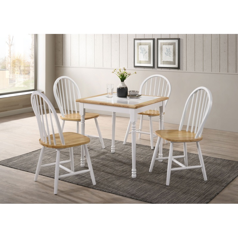 Create a bright, airy ambiance in your dining space with this two-tone five-piece dining set. The set includes a square table for a cozy gathering and four spindle back chairs with wood seats. The table is crafted with sturdy turned legs that are stylish and supportive. The chairs have angled legs with supports for a casually assertive appearance. The tabletop and seats have a natural brown finish while the legs and seat backs all come in a chic white finish.