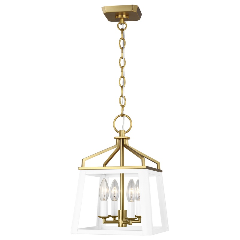 The Carlow four-light single-tier chandelier in matte white is a traditional tapered square lantern that is wider at the base and smaller at the top. The lantern’s body has either a black or white metal frame suspended from, and accentuated by, a brass square tube armature. The brass armature is the focal point of the design and almost looks like a crown on top of the lantern frame.