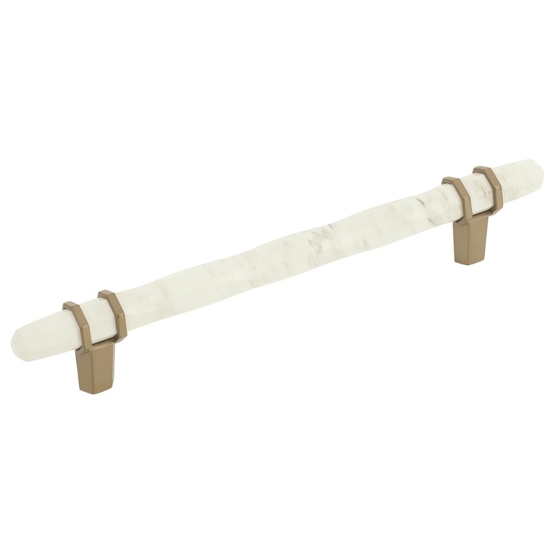 The Amerock BP36650MWBBZ Carrione 6-5/16 in (160 mm) Center-to-Center Pull is finished in Marble White/Golden Champagne. From the winding bed of Italy's Carrione River comes the coveted carrara marble. Crafted by hand and balancing timeless beauty with cle