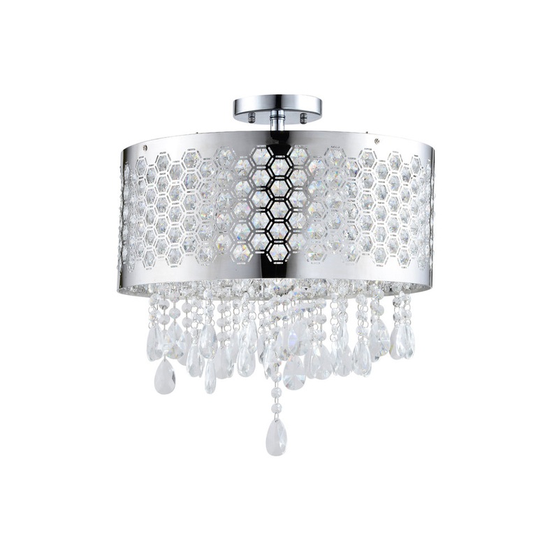 This Catalyn Modern Chrome and Crystal 4-light Flushmount by Artiva USA is the perfect addition to any room in your home. The elegant, modern design adds a rich, opulent ambiance to any room. The stainless steel shade features a laser-cut hexagon pattern t