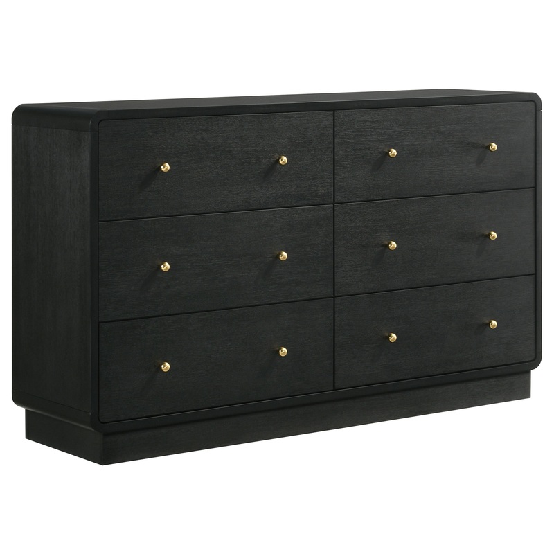 Complement a stylish bedroom with the abundant storage featured in a modern six-drawer dresser. Delivering a sophisticated presentation, it boasts a black finish over melamine surfaces that resist damage to remain looking their best. Ball knobs complement each drawer front, standing out with a rich, warm brass finish. The case of the dresser features rounded corners, softening the overall presentation of the dresser. A wide top is ideal for jewelry boxes and decor that lends a personalized touch.
