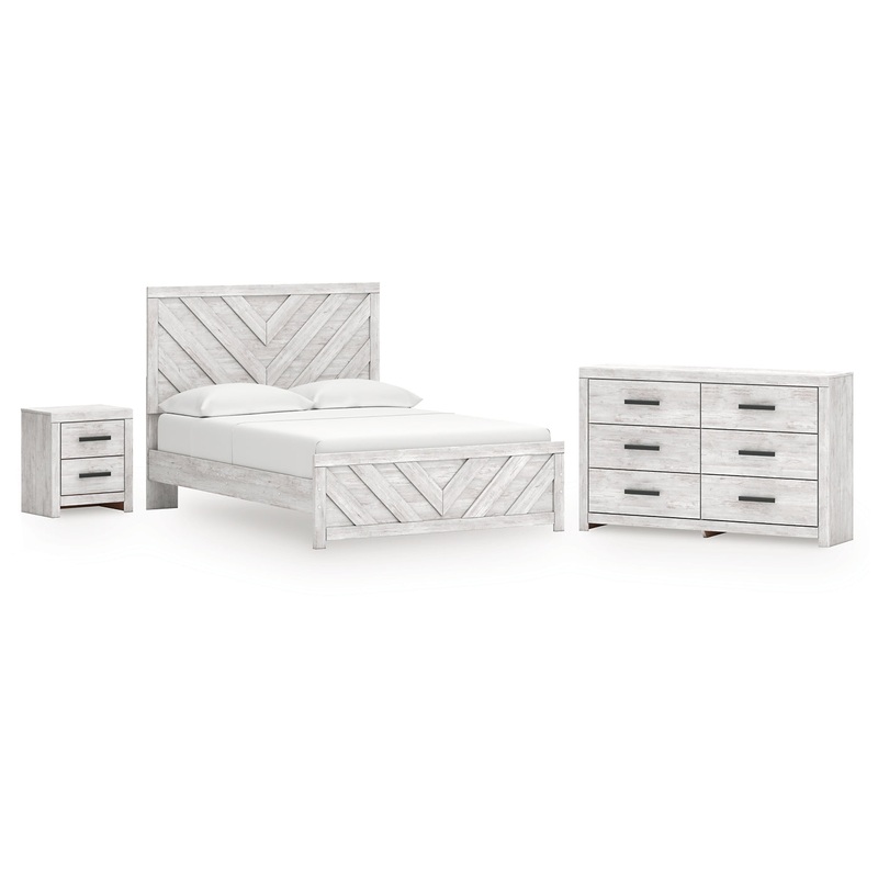 Charmingly designed, this queen panel bed embraces the aesthetics of countryside living and repurposes them for modern settings. Its whitewash paint, replicating the wear and tear of time, appeals to your love of vintage character. And a chic chevron pattern on the headboard and footboard keeps your bedroom effortlessly on trend. Dresser and nightstand included.
