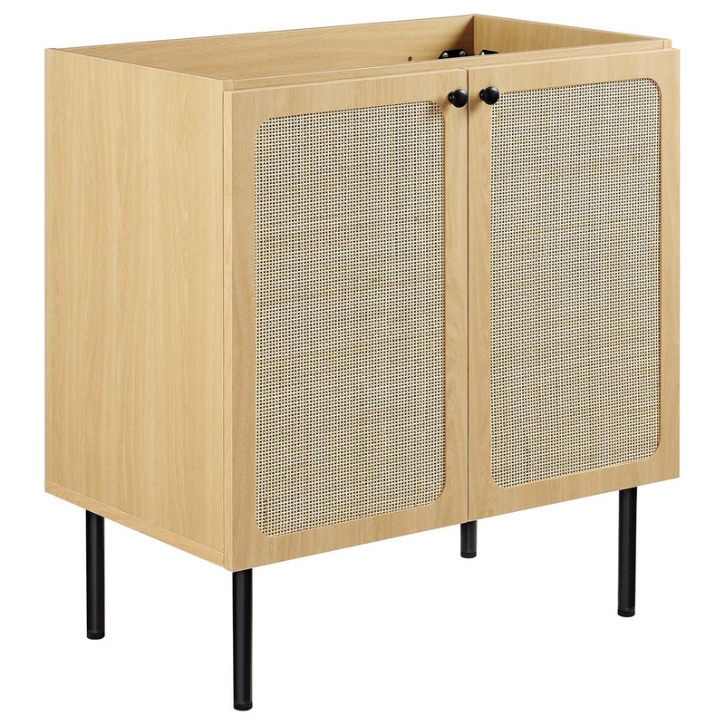 Refresh your washroom with the textured detail of the Chaucer 30″ Bathroom Vanity Cabinet. Featuring beautiful rattan weaving on its doors, this vanity cabinet instantly updates any bathroom or powder room. A spacious adjustable top shelf and a fixed bottom shelf hidden behind its hinged doors offers ample storage space for toiletries, towels, and other bathroom essentials. Enriched by stylish round metal cabinet knobs and resting on sleek legs with adjustable feet for added stability, this bathroom cabinet is durably crafted with MDF, particleboard, and wood grain laminate to bring natural organic aesthetics to your decor. Assembly required. Fixtures and sink basin not included. Top Shelf Weight Capacity: 40 lbs. Bottom Shelf Weight Capacity: 81 lbs.