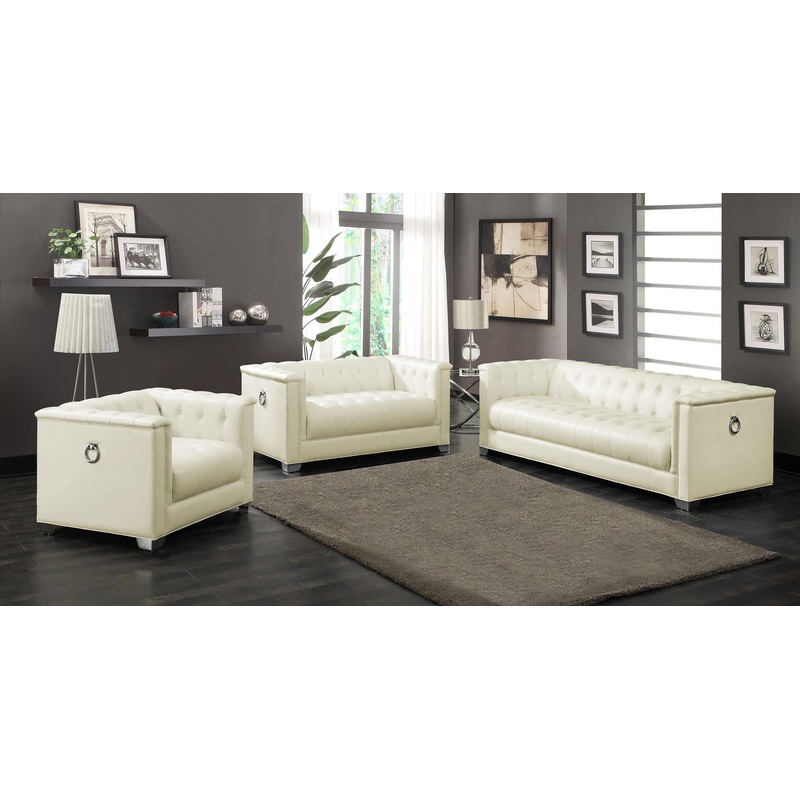 Sleek lines and chic details elevate this glamourous three piece living room set. With a contemporary styling low profile, the silhouette of the sofa, loveseat, and chair are modern. Deep button tufting and quilted detailing are given a crisp feel with white padded, breathable leatherette upholstery. Stylishly bright, the chrome heavy duty doorknocker handles and legs create visual intrigue. Dress up a space with the light hues and radiant metallic details.