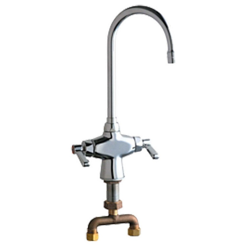 The Chicago 50-TE35ABCP Manual and Metering Faucet. This hot/cold water sink faucet features single-hole installation, a set of 2-3/8" lever handles, a 5-1/4" rigid/swing gooseneck spout, and a 1.5 GPM aerator. It comes with a Quaturn compression operating