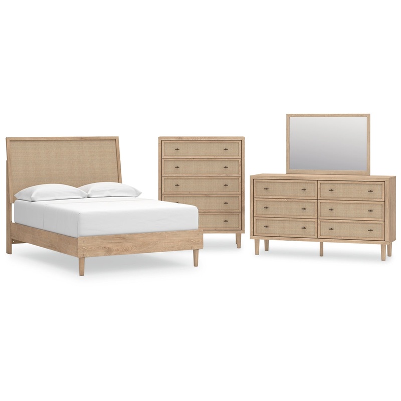 Clean-lined and contemporarybut far from starkthis bedroom package is a fresh style awakening. Pairing a light finish with replicated oak grain and textured beige details that replicate the look of cane, its mixed materials bring a naturally versatile vibe to your bedroom. Sleek, simple hardware plays perfectly with the modern aesthetic.