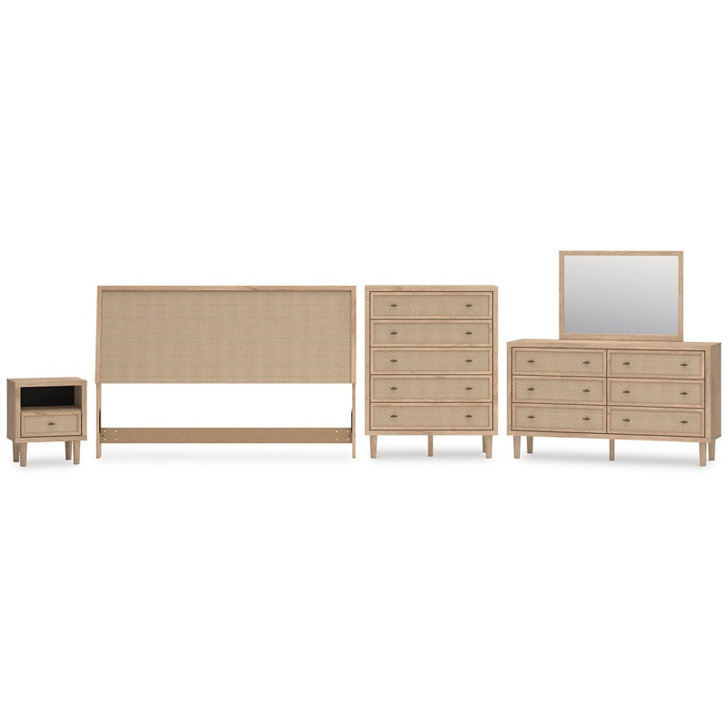 Clean-lined and contemporarybut far from starkthis bedroom package is a fresh style awakening. Pairing a light finish with replicated oak grain and textured beige details that replicate the look of cane, its mixed materials bring a naturally versatile vibe to your bedroom. Sleek, simple hardware plays perfectly with the modern aesthetic.