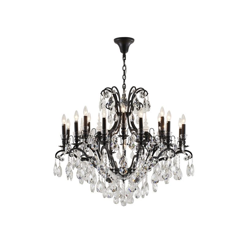 This modern chandelier is in a sandy black finish. Nineteen E12 bulbs (sold separately) can provide better illumination. Clear crystal adornments make the fixture more exquisite. Lighting Information: -Bulb type: E12 -Max wattage: 40 -Number of bulbs: 19 -