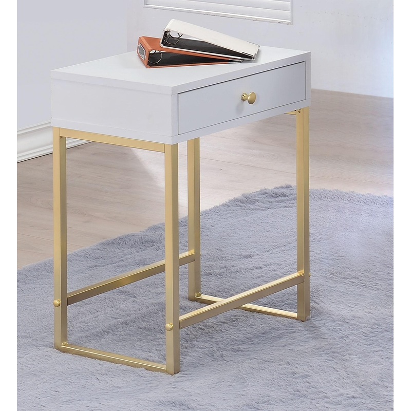 ACME Coleen Side Table, White & Brass, 16" x 12" x 22"H, 29lbs. Bring the trending contemporary style into your home with this updated Coleen side table. This side table comes with a drawer providing you an additional space to storage. With featuring white