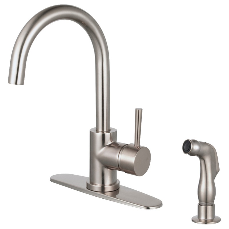 This faucet boasts bold, sleek design w/ its cylindrical styling. Easily adaptable to any kitchen, the Gourmetier Concord single-handle kitchen faucet is prized for its easy-to-use single handle. This makes it the perfect fixture for multitasking as you can adjust temperature and volume in one swipe. Enjoy the strong and durable brass material and brushed nickel finish that will last for years to come. The included matching finish side-sprayer also adds convenience in cleaning hard-to-reach areas. Stainless steel deck plate included for 2 or 4-hole installation.