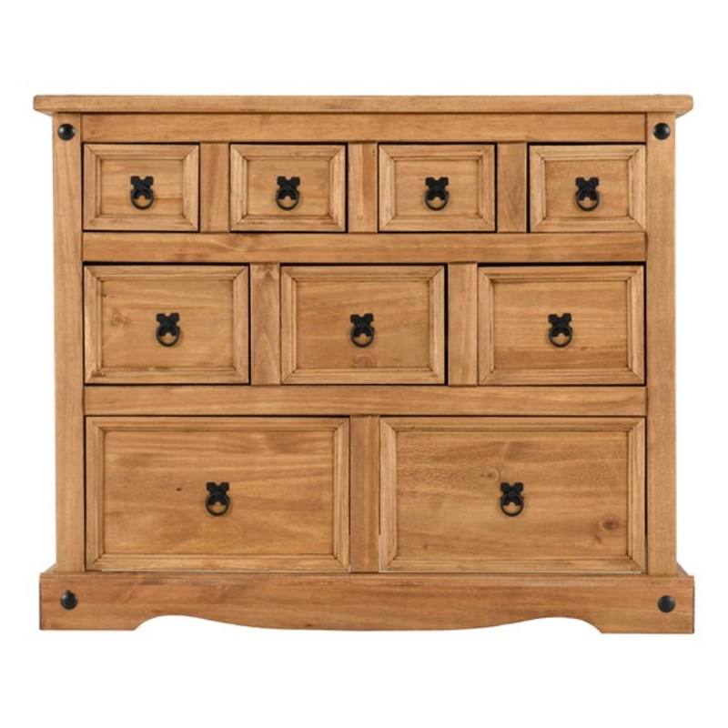 Store all your bedroom bits and pieces, like jewellery, with the Corona Merchant Chest. It features four small drawers near the top, three medium sized drawers in the middle and two large drawers near the bottom, all boasting an evocative Mexican design wi