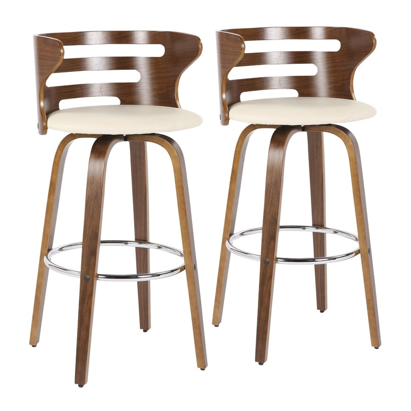 The walnut wood backrest of the LumiSource Cosini Barstool hugs the body with graceful, curved lines. Tapered bent wood legs are joined by a circular chrome footrest for support and durability. Add in a cushioned upholstered seat and the Cosini Barstool be