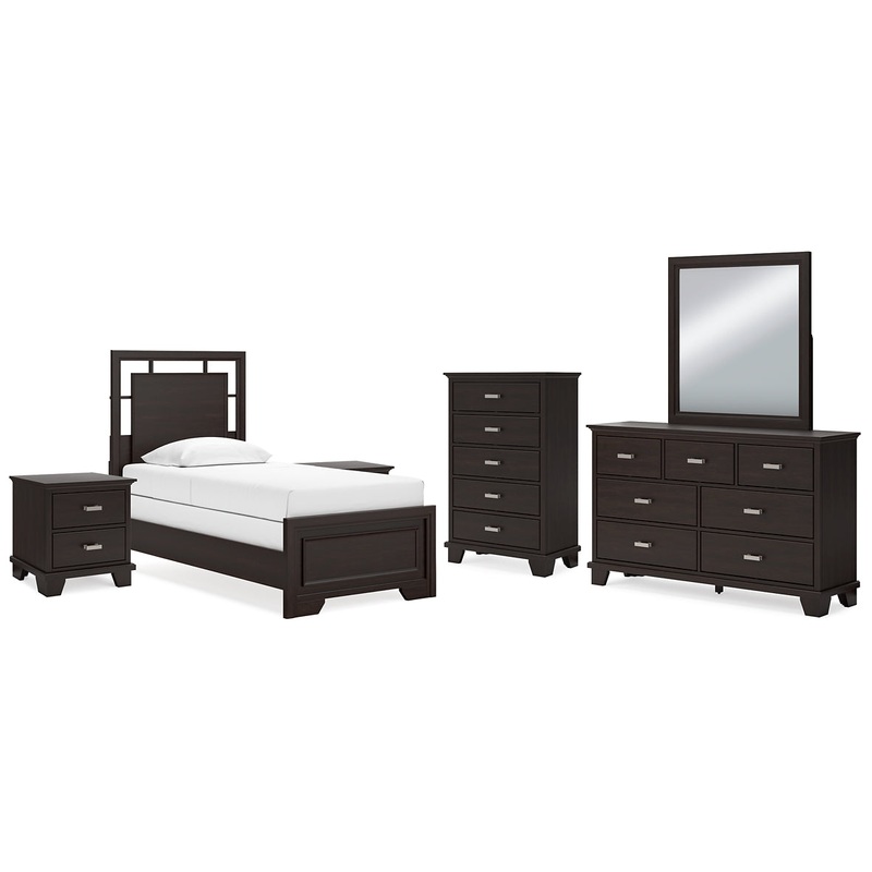 Covetown Twin Panel Bed with Mirrored Dresser, Chest and 2 Nightstands