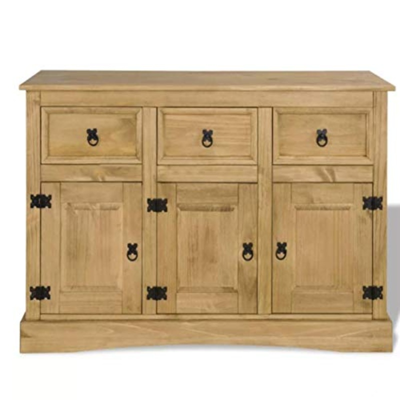 Dettagli: Specifiche:Colore: marrone.Materiale: pino massiccio.Dimensioni: 132 x 43 x 78 cm (L x P x A).Con cassetti e scomparti.Si abbina con lo stile messicano “Corona”.Facile da montare.La confezione include:1 x credenza