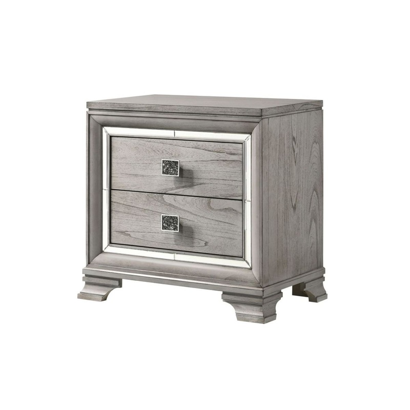Crown Mark Vail Nightstand in Grey B7200-2. This charming Vail nightstand from Crown Mark provides extra storage space and blends in easily with any decor. It comes in a light grey finish and features two drawers and bevel mirror accents.