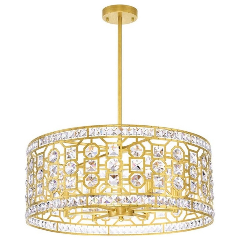 Ready to complete any setting beautifully, the Belinda 6 Light Chandelier displays an eye-catching glamour with its champagne finish and glittering clear crystal prisms. This brilliant light source features a 23 inch laser-cut metal drum shade with a geome