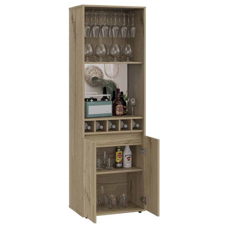 The Dallas Bar Cabinet brings stylish design combined with a fantastic finish that is sure to impress your guests. a 10-steamware rack (standard wine glass) and a shelf for your short glasses. A fantastic feature is a middle shelf with a mirrored back panel and 18.3 inches high to prepare drinks and place your speakers. Five cubbies for wine or liquor bottles will provide you some extra storage. A two-door cabinet with an interior shelf is featured at the bottom. Giving you all the storage space you might need to keep any gathering going.