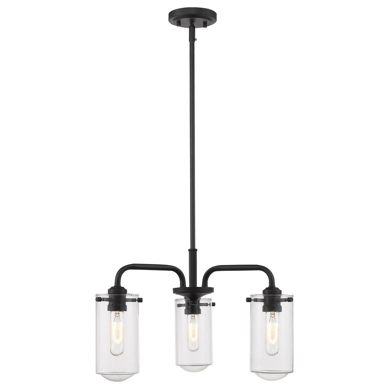 An intriguing mix of modern and industrial, this three-light chandelier is a charming addition over a breakfast nook or greeting guests in an entry. A matte black finish is accentuated with stylish clear glass shades that create the perfect spot for vintage-style bulbs.