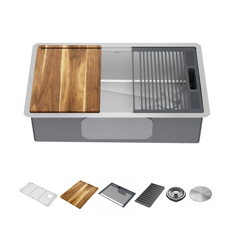 Delta 95B932-32S Features: Ledge creates a multi-functional kitchen workspace Reduces clutter by allowing you to work right over the sink Sleek rounded corners offer a clean transitional look that will blend perfectly with any kitchen style Engineered for long-lasting durability, made with heavy-duty high-performance 16 gauge stainless steel to stand up to everyday needs Undermount sink installs seamlessly to create a clean look with no exposed mounting deck, allowing you to wipe water and crumbs into the sink Spacious single bowl design with a rear-offset drain offers generous space for washing large items and more storage space in the base cabinet Extra-thick sound-absorbing pads on all sides of the sink greatly reduces noise and vibration while the sink is in use Anti-condensation undercoating helps prevent moisture build-up to reduce the risk of water damage inside base cabinets Non-porous surface and tightly rounded EZClean corners on the bottom of the sink that help prevent buildup over time Kit includes: sink, acacia cutting board w/ mobile device holder, roll-up dish drying rack w/ removable utensil holder, stainless steel bottom grid, stainless steel drain assembly w/removable cover Delta 95B932-32S Specifications: Number of basins: 1 Outer sink dimensions: 32″ L x 19″ W x 9.5 D Bowl dimensions: 30″ L x 16″ W x 9 D Minimum cabinet size: 36 Number of faucet holes: 0 Drain hole size: 3.875″ About Delta Lorelai: The Delta Lorelai Workstation Collection is defined by sleek lines and gently rounded corners, offering a clean transitional look that blends perfectly with any kitchen style. These sinks are designed with a built-in WorkFlow ledge that helps make food prep easy by allowing you to slide accessories across the sink, creating a multifunctional workspace for seamless transition between tasks. The kit includes a durable cutting board and roll-up dish rack with removable utensil holder that allow you to combine prepping and cleaning in one convenient location. Heavy-duty TRU16 gauge construction offers lasting durability so that you can use your sink with confidence. The undermount design installs seamlessly to create a clean look with no exposed mounting deck, allowing you to easily wipe water and crumbs into the sink. The deep single bowl offers enough room to wash large items while containing mess and splatter inside the sink. NoiseDefend soundproofing reduces noise and vibration from dishes, water, and garbage disposal. SatinSheen finish provides a smooth surface thats easy to clean, so your sink stays beautiful with less effort. Channel grooves and a sloped bottom improve drainage, while EZClean corners reduce build-up over time. The installation-ready sink includes all mounting hardware and a stainless steel drain assembly to get your installation moving fast. You can feel comfortable in your kitchen knowing that Delta sinks are backed by a Lifetime Limited Warranty