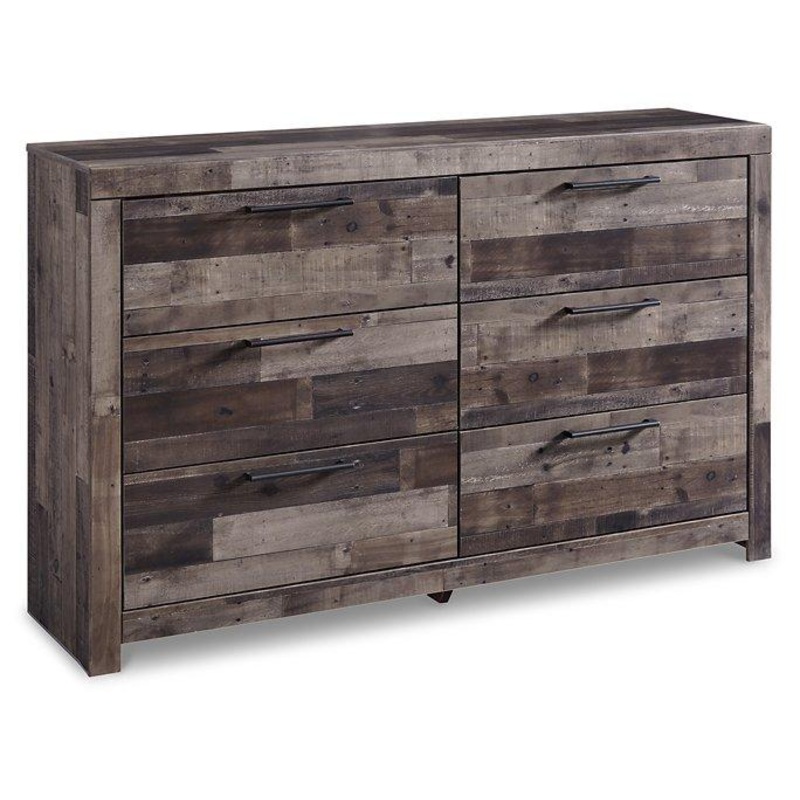 Modern yet hefty. This dresser makes an urban eclectic statement. Seasoned raw wood look merges with the clean lined design we love today. Muted rustic finish over replicated pine grain maintains its authenticity. Roomy drawers are flanked with attractive framed front and pilasters. Handles with antiqued gunmetal finish complete this beauteous look with easy to pull function.