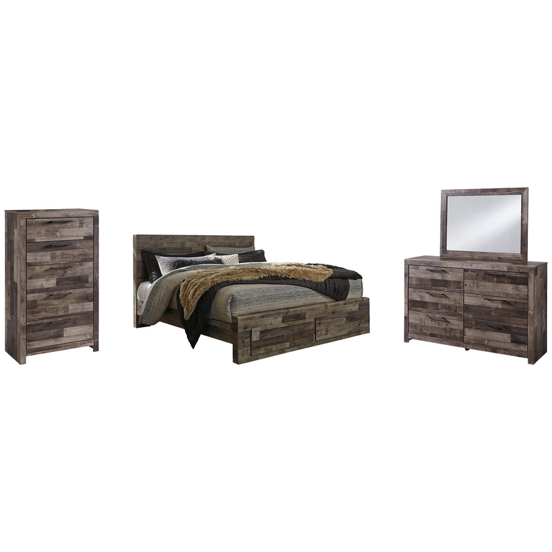 Derekson King Panel Bed with 2 Storage Drawers with Mirrored Dresser and Chest