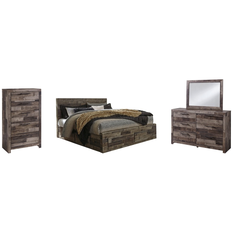 Walk the line between industrial and farmhouse styles with the modern heft of this panel storage bed, chest of drawers and dresser with mirror. A rustic butcher block finish is tastefully roughhewn with appealing color variations and imperfections. Integrated storage in this substantial bed provides ample space for belongings while the chest and dresser showcase roomy drawers with metal pulls in an antiqued gunmetal finish to complete this eclectic look.