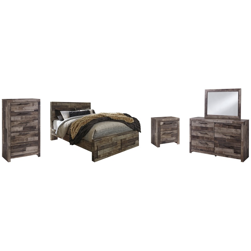 Walk the line between industrial and farmhouse styles with the modern heft of this panel bed with storage, nightstand, chest of drawers and dresser with mirror. A rustic butcher block finish is tastefully roughhewn with appealing color variations and imper