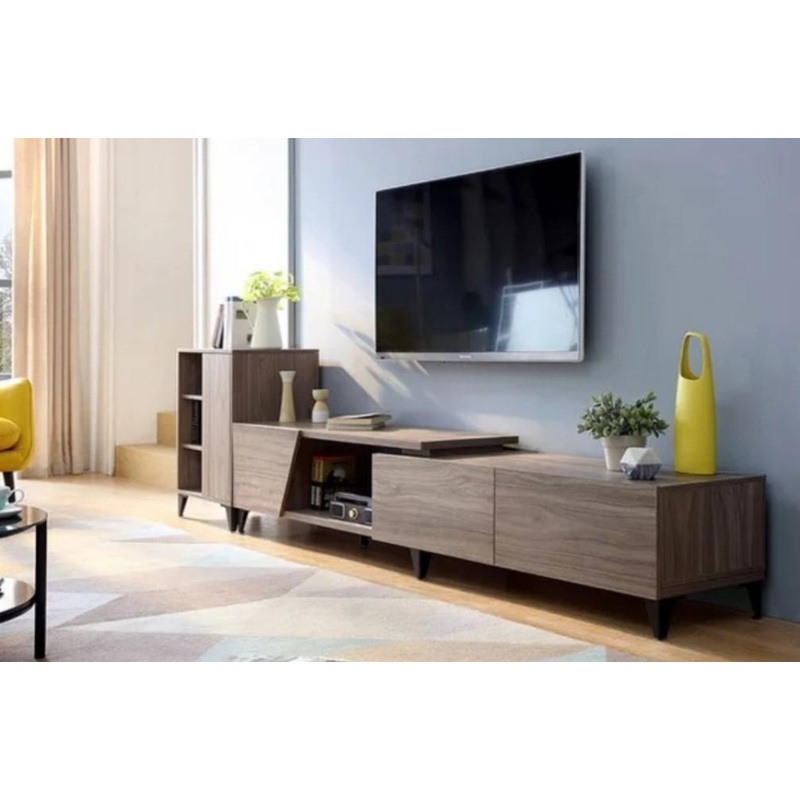Specially designed to combine function with style, this tv console also doubles as a display cabinet with plenty of room and compartments to display and store plants, frames, and ornaments. Extendable to 210cm, the console is wrapped in a textured walnut veneer that is waterproof and heat resistant. A wonderful addition to any modern, rustic, or minimalist home.