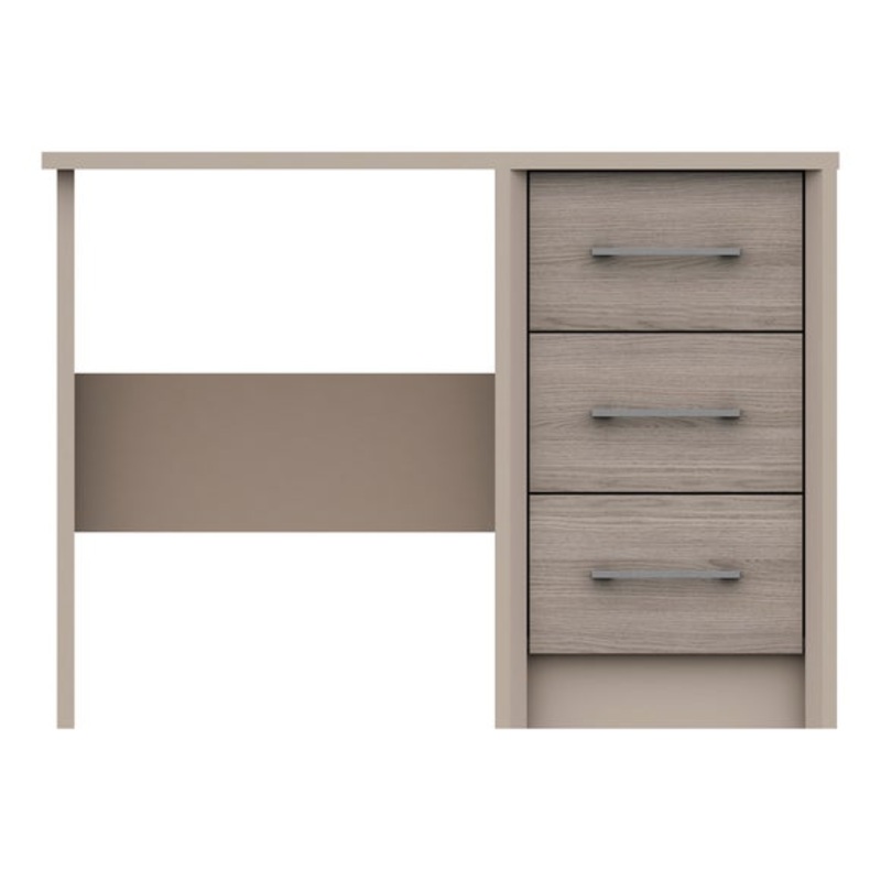 The Dolan dressing table would make a stylish addition to any bedroom. This modern dresser features a spacious worktop and three generously sized drawers, complete with stylish brushed pewter finished slim handles, linen-look drawer insides, 8mm heavy duty