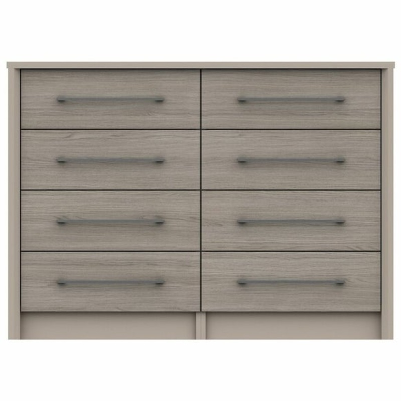Crafted with a coloured carcass with complementing oak effect drawer fronts, the Dolan 8 Chest of Drawers would make a stylish addition to any bedroom. This modern chest of drawers features 8 spacious drawers complete with stylish brushed pewter finished slim handles, linen-look drawer insides, 8mm heavy duty bases and easy glide runners for ease of use.