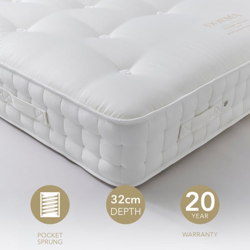 This sumptuous Dorma 1000 Pocket Sprung Mattress is made with high quality horsehair and a rebound blend of polycotton, polyester and cotton.