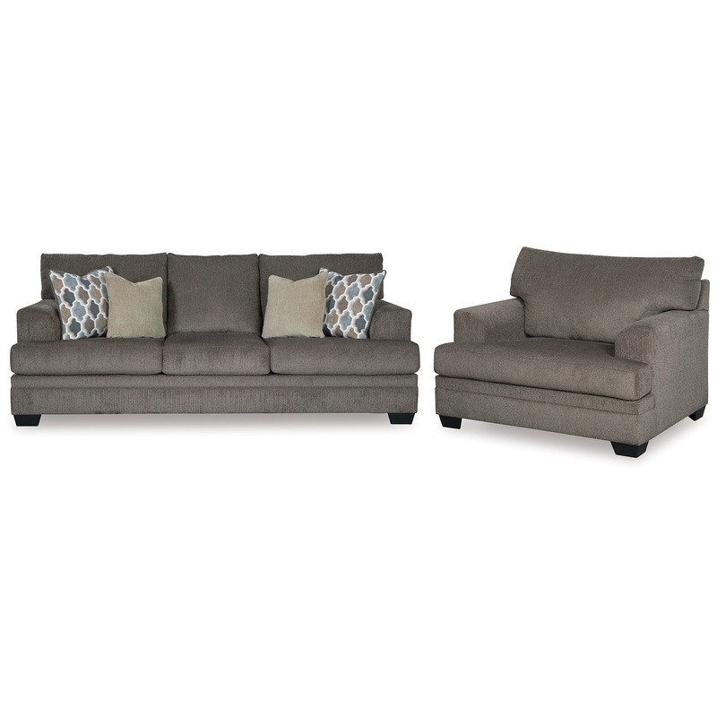 This contemporary sofa with oversized chair set has comfort written all over it. From the plush cushions to the textured gray fabric, its a total winner for relaxation. Designer throw pillows in blue, brown and tan complement the richly neutral upholstery.