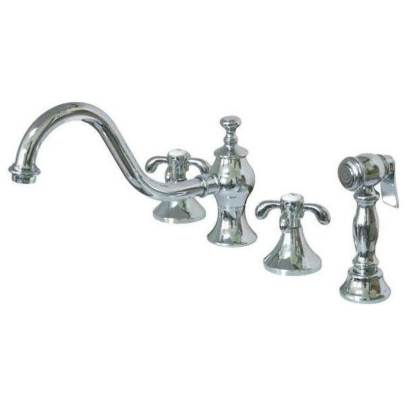 The products from the French Country collection each share a common look with its cross handle levers and the variety of hook-shaped spouts. This widespread kitchen faucet features an accompanying brass sprayer, two bell-shaped escutcheons and a heritage spout. Adopted from traditional European glamour, the faucet is available in four different finishes–each of our polished layering provides different colors to help coordinate your bathroom the right way.. Manufacturer: Kingston Brass. Model: KS7761TXBS. UPC: 663370105708. Product Name: Kingston Brass French Country Double Handle 8″ Widespread Kitchen Faucet with Brass Sprayer. Collection / Series: French Country. Finish: Polished Chrome. Theme: Classic. Material: Brass. Type: Faucet. Features: Includes Brass Sprayer
