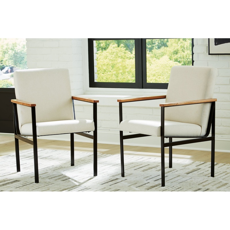 Discover something extraordinary with this upholstered dining arm chair. Its wood armrests are paired with a black metal frame for a clean-lined contemporary appeal. Strikingly simple, this piece creates an understated, modern feast for the eyes whether its used for dining or when friends drop by to hang.