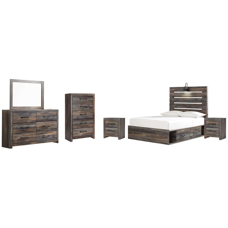 When merged in just the right way, rustic and industrial styles can make one happy marriage. Case in point: this bedroom set with storage bed, dresser/mirror, chest and dual nightstands. A refined take on barn board beauty, its complex, replicated wood grain showcases hints of burnt orange and teal tones for a sense of weatherworn authenticity. Love to read in bed? Youre sure to find the retro-chic light sconce and USB plug-ins on the open-slat style headboard such a bright idea. Underneath the bed: smooth-gliding drawers and open cubbies that accommodate casually cool storage bins. Elongated metal drawer pulls elevate the aesthetic.