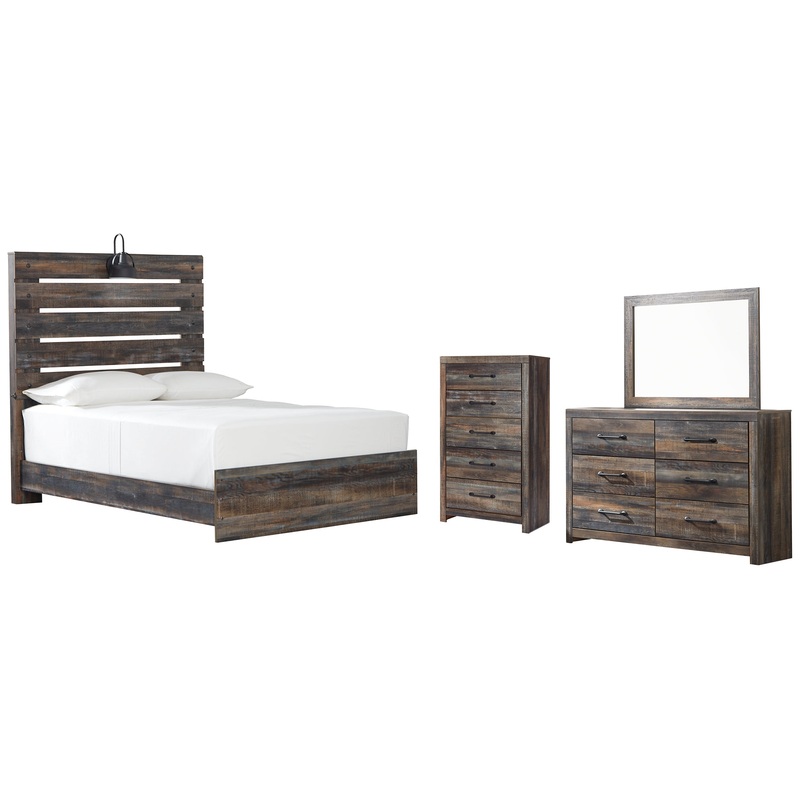 This queen-size panel bed, dresser, mirror and chest of drawers is a refined take on barn board beauty. Its complex, replicated wood grain showcases hints of burnt orange and teal tones for a sense of weatherworn authenticity. Love to read in bed? Youre sure to find the pair of retro-chic light sconces and USB plug-ins on the open-slat style headboard such a bright idea. The dresser and chest with smooth-gliding drawers lined with faux linen laminate and industrial dark-tone hardware complete this rustic and industrial style bedroom. Mattress and foundation/box spring available, sold separately.