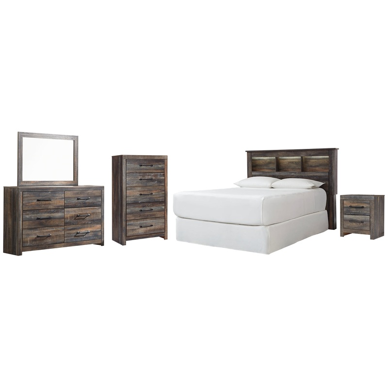 When merged in just the right way, rustic and industrial styles can make one happy marriage. Case in point: this bedroom set with bookcase headboard, dresser/mirror, chest and nightstand. A refined take on barn board beauty, its complex, replicated wood gr