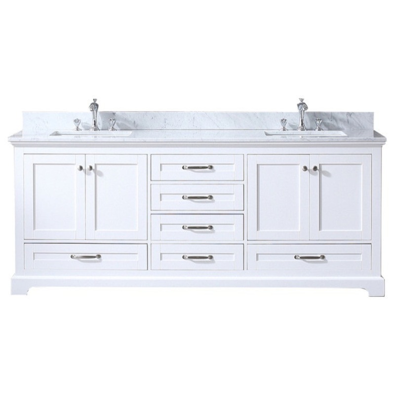 80 inch White Double Vanity with White Carrara Marble Top with White Ceramic Square Undermount Sinks and no MirrorInspired by classic elements, the Dukes bathroom vanity in white has been upgraded to suit the needs of the modern home. One look at the subtle embellishments in the vanity structure, and the timeless look of the countertop, and you can see the classical inspirations in this piece. But with ample cabinet and drawer space, soft-close hinges and drawer slides, and superior water resistance, this vanitys incredible functionality is purely modern. The vanity also comes complete with undermount sinks, making it easy to give your bathroom that elegant finishing touch youve been searching for.