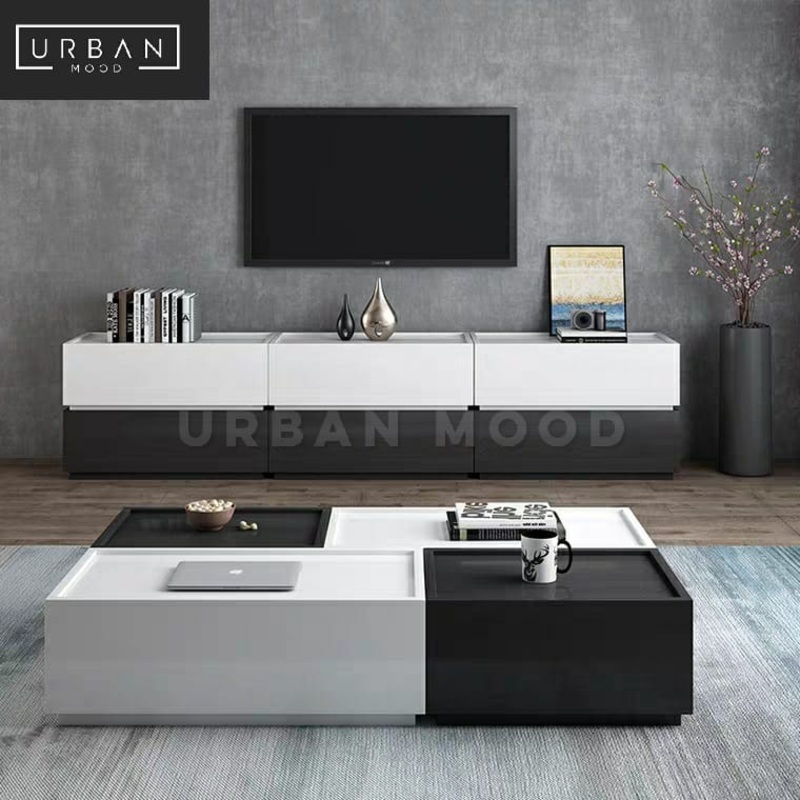 Dimensions (cm): 4 drawer 146L x 40W x 48H 6 drawer 219L x 40W x 48H Coffee Table 124L x 80W x 24H Colours: Black White Interior themes: Modern/Contemporary Minimalist Industrial Classic Monochrome